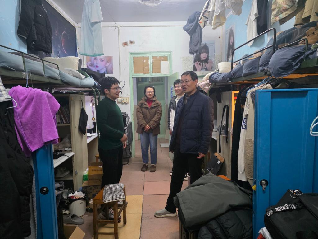 走访中,党委书记李辉重点关切考研学子的备考进度与身心状态,详细询问复习规划、目标院校选择及备考困难,结合经验给予针对性指导。他们鼓励学子坚定信心、合理作息、保持良好心态,同时提醒注重劳逸结合,以饱满状态迎接考试。安全检查环节,老师们重点排查违规电器使用、私拉乱接电线等隐患,查看消防器材配备情况。针对冬季火灾风险与流感防控需求,叮嘱学生强化安全意识、遵守宿舍规定,保持宿舍通风整洁,共同营造安全舒适的住宿环境。